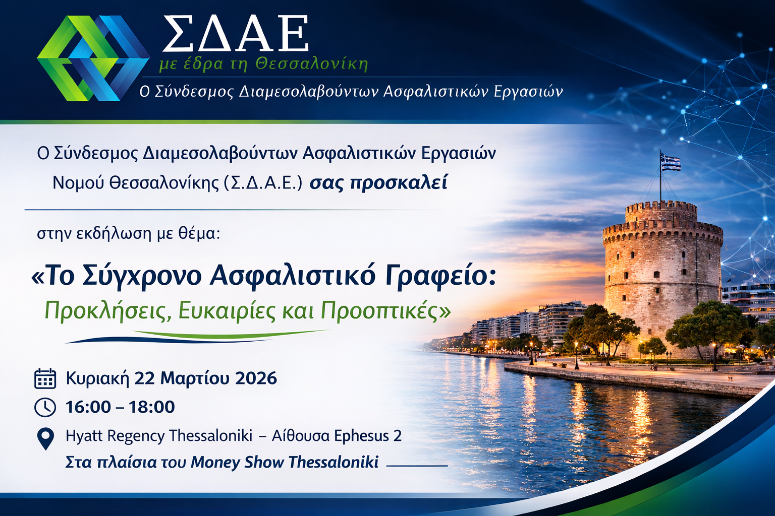 Ο Σύνδεσμος Διαμεσολαβούντων Ασφαλιστικών Εργασιών Ν. Θεσσαλονίκης (Σ.Δ.Α.Ε.) διοργανώνει ανοιχτή εκδήλωση στο πλαίσιο του Money Show Thessaloniki, με θέμα το σύγχρονο ασφαλιστικό γραφείο και τις προκλήσεις που αντιμετωπίζουν σήμερα οι επαγγελματίες της ασφαλιστικής διαμεσολάβησης.