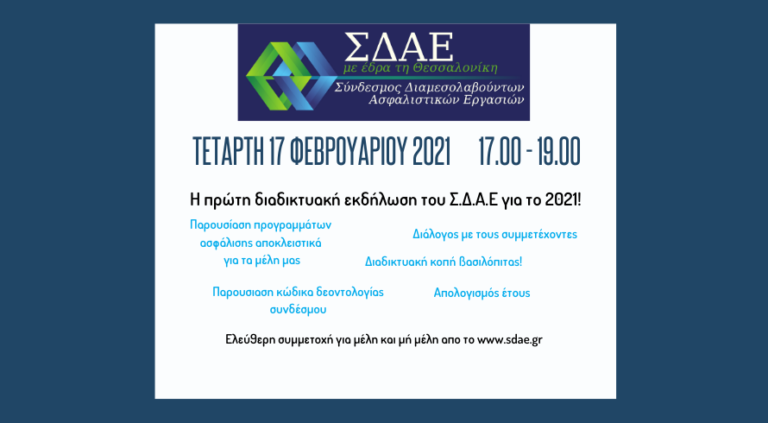 Ο Σύνδεσμος Διαμεσολαβούντων Ασφαλιστικών Εργασιών Ν. Θεσσαλονίκης διοργανώνει την πρώτη εκδήλωση των μελών του για το νέο έτος. Όπως είναι αναμενόμενο λόγω των ιδιαίτερων συνθηκών